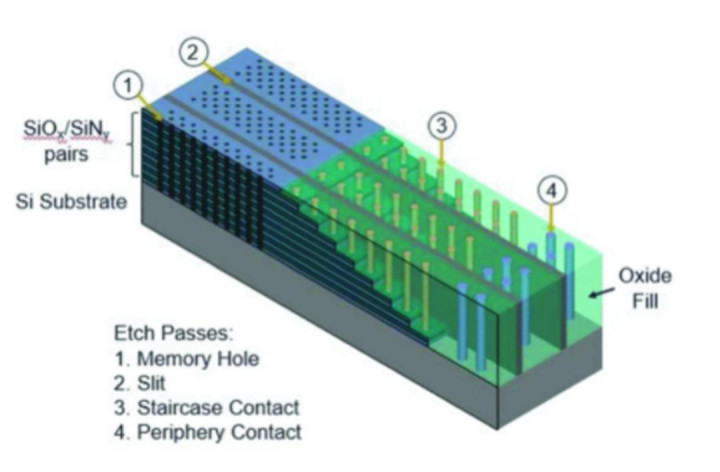 图1:3D NAND 的关键特征包括微小的存储孔、狭缝、阶梯状触点和外围触点。来源:Lam Research